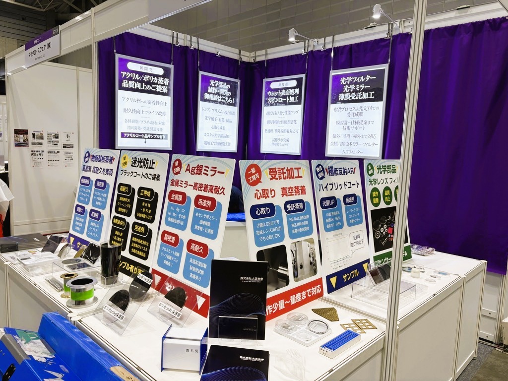②樹脂ARコートなどにも強い関心をお持ちいただきました。特にアクリルレンズへのトップコート無しARは、昨今のVR/ARレンズなどへの形状維持要求を受けて強い関心を頂きました。ただし、4月展示会に比較して、若干問い合わせが少なくなってきている印象でした